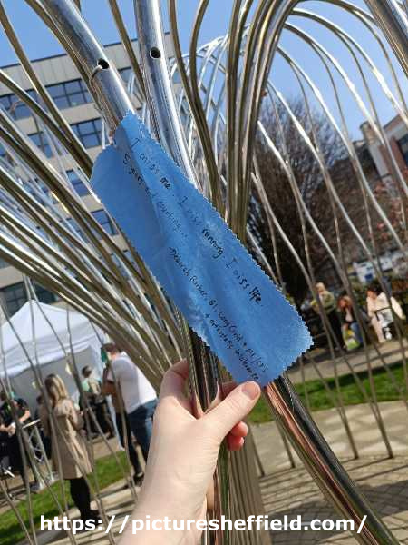 Messages from the public which were hung on the Covid memorial willow tree sculpture at the event. The wooden leaves were made at a workshop held in the gardens on the day and contributed by attendees and the public.