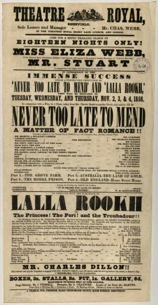 Theatre Royal, Sheffield. Sole lessee and manager Mr Chas. Webb [Charles Webb], of the Theatres Royal Drury Lane and Lyceum, London. Open for a short dramatic season of 18 nights only! Miss Eliza Webb of the Theatres Royal Manchester, Edinboro’ [Edinburgh], and Lyceum, will appear in the gorgeous eastern burlesque of Lalla Rookh. Mr Stewart,is engaged for a few nights and will appear in the play. In consequence of the immense success which attended the production of Never Too Late to Mend and Lalla Rookh, They will be repeated on Tuesday, Wednesday, and Thursday, Nov. 2, 3, and 4, 1858. To commence with a play, in 4 parts, taken from Mr Charles Reade's popular novel, and called It Is Never Too Late to Mend A Matter of Fact Romance!! Expressly adapted for the Theatre Royal, Sheffield by J. B. Johnstone, esquire and Mr Charles Webb. To conclude with the burlesque of Lalla Rookh or, The Princess! The Peri! And the Troubadour!! The burlesque, written by Mr William Brough. The new and gorgeous scenery, painted by Mr Henry Saunders, assisted by Mr Miles Jones and others. The elaborate mechanical effects, by Mr Caunt. The properties and appointments, by Mr Harvey. And the costly dresses, by Mr Samuel May, the celebrated costumier, of Bow Street, Covent Garden. Mr Charles Dillon!! This eminent and popular tragedian is engaged for six nights only, and will shortly make his first appearance this season, in Bulwer’s play of Richelieu, which is now in preparation. [Performers]: Mr Barton, Miss Emily Bathurst, Miss Braham, Miss Campbell, Miss Campbell, Miss E. Collier, Miss Jane Collier, Mr F. Craxford, Mr Charles Dillon, Mr Harris, Mr Charles Horsman, Miss Jones, Mr Lambert, Miss Annie Ness, Mr John Neville, Miss Laura Selton, Mr Simpson, Miss Emily Smyth, Mr G. H. Smythson, Mr Stuart, Mr J. Tyrrell, Mr Charles Webb, Miss Eliza Webb, Mr H, West. Boxes 3s., Stalls, 2s., Pit 1s., Gallery 6d. Half price to boxes only at nine o’clock. Stage director, Mr. J Tyrrell. Prompter, Mr F Craxford. Leader of the band, Mr Harvey. Doors open at half past six, to commence at seven. No smoking allowed. Children in arms not admitted. J. Pearce, jun., Printer, Daily Telegraph Office, High Street, Sheffield.