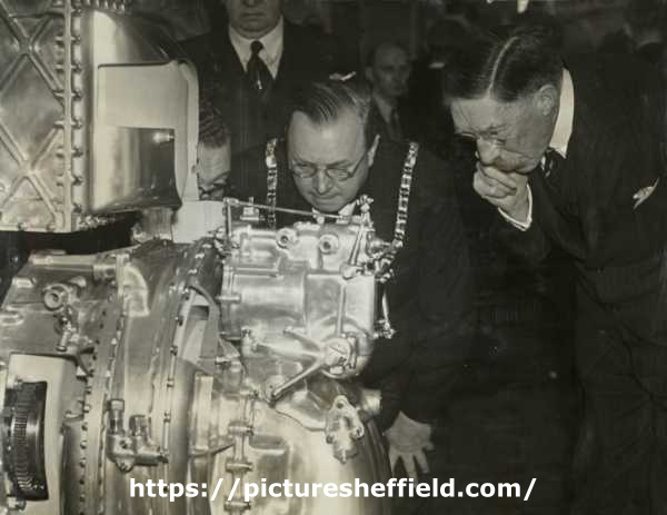 | Lord Mayor, Councillor Samuel Hartley Marshall JP with Lord Harwood (Henry George Charles Lascelles, 6th Earl of Harewood (1882 - 1947) examining a supercharged aeroplane engine at the Ministry of Supply, Fargate House, Nos 19 - 23 Fargate | |
