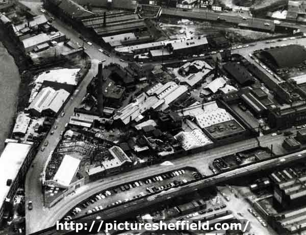 The original line of Windsor Street was bottom right to top left, through the industrial premises, which were Royds Engineering Works and Royds Silver Works, and the branch to the left was formerly Royds Lane. Royds Mill Lane, now extinguished, runs left to right near the top, with Effingham Steel Works and Rolling Mills above, and Attercliffe Road at the very top. Royds Mill Lane was extinguished between 1953 and 1965. The building in the angle between Princess Street and Royds Lane (now Windsor Street) first appears between 1935 and 1953, so the picture can be dated between 1935 and 1965.