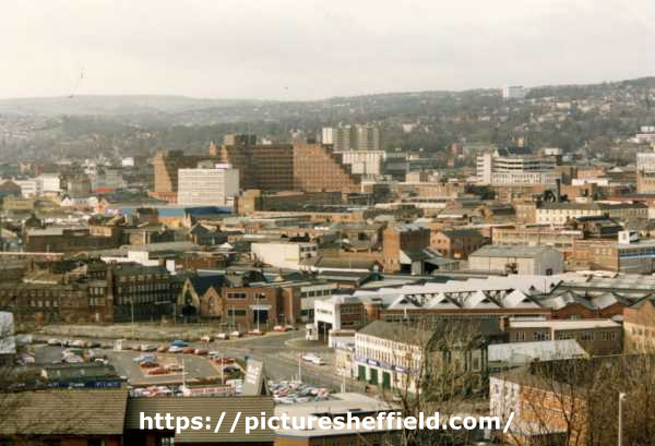 | View from Cholera Monument of the City Centre showing (bottom right) former Leadmill Road transport depot and (top centre) Manpower Services Commission | |