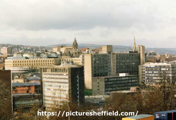 | View from Cholera Monument of the City Centre showing (bottom left) Sheaf House, offices, (centre left) Town Hall extension (known as the Eggbox) and (right) Sheffield Polytechnic | |
