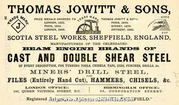 | Advertisement for Thomas Jowitt and Sons, files, rasp and engineers tools manufacturer, Scotia Steel Works, Green Lane, Netherthorpe | |