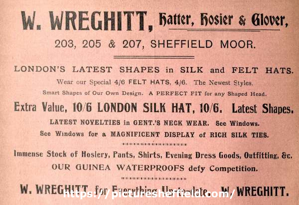 | Advertisement for W. Wreghitt, hatter, hosier and glover, Nos. 203 - 207 Sheffield Moor | |