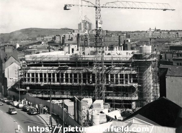 | Construction of the new South Yorkshire Police Headquarters (latterly Snig Hill Police Station), Snig Hill showing (bottom right) Buywell Furnishing, Castle Street | |