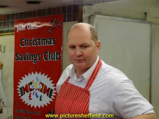 | Market worker beside his Christmas Savings Club sign during the last days of Castle Market | |
