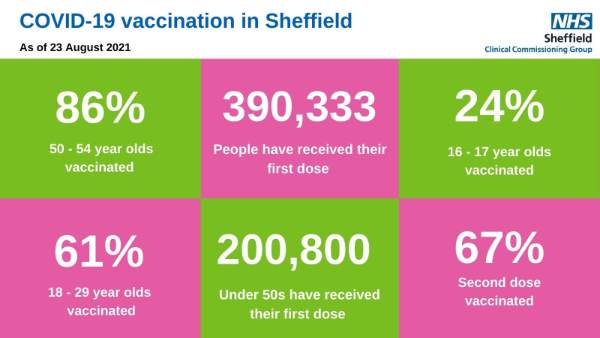 | Covid-19 pandemic: Sheffield Clinical Commissioning Group (CCG) graphic - Covid19 vaccination in Sheffield as of 23 August 2021 | |