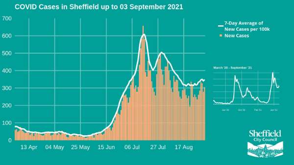| Covid-19 pandemic: Sheffield City Council graphic - Covid cases in Sheffield up to 3 September 2021 | |