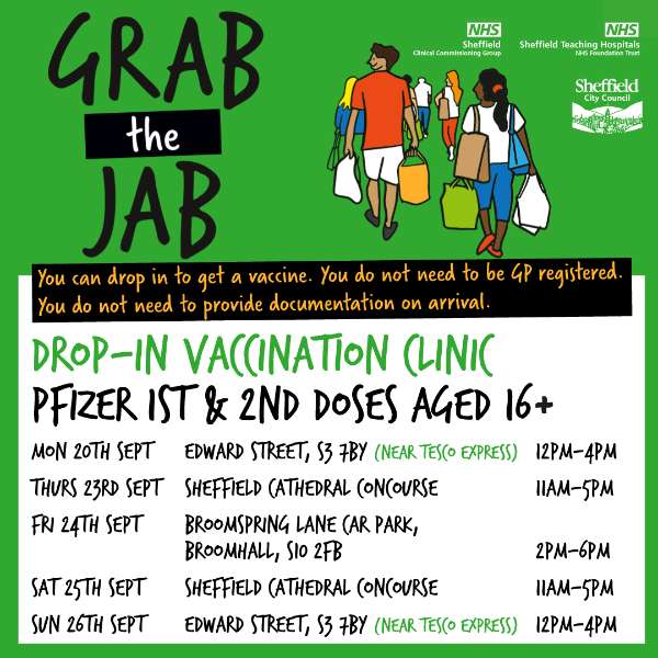 | Covid-19 pandemic: Sheffield City Council / NHS graphic - Grab the Jab - You can drop in to get a vaccine. You do not need to be GP registered. You do not need to provide documentation on arrival | |