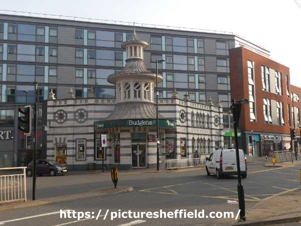 | Budgens Supermarket, London Road showing (back) The Forge, Sheffield Hallam University student accommodation, Boston Street | |