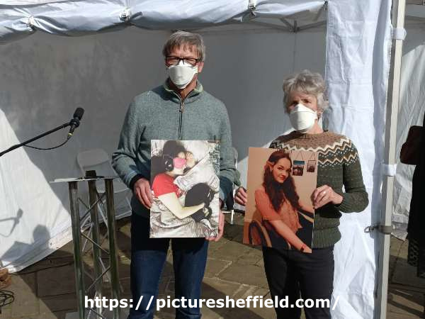 | Parents of Fran Haddock, a sufferer from Long Covid, listening to her recorded message, Covid Memorial Day, 2025 in Balm Green Gardens | |