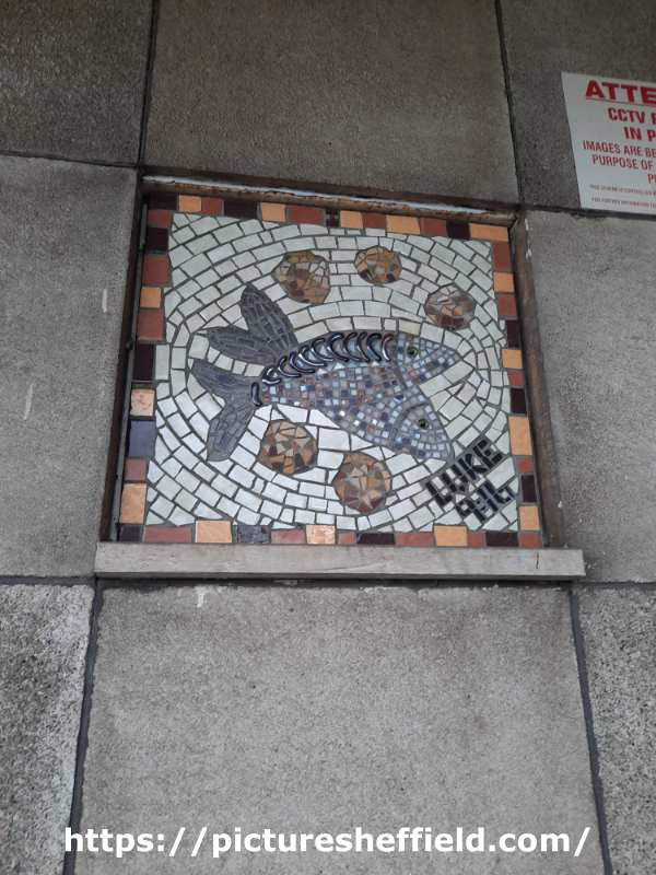 Wall mosaic (based on Luke 9:16, loaves and fish), Parish hall and church office, All Saints C. of E. Church, Ringinglow Road, Ecclesall