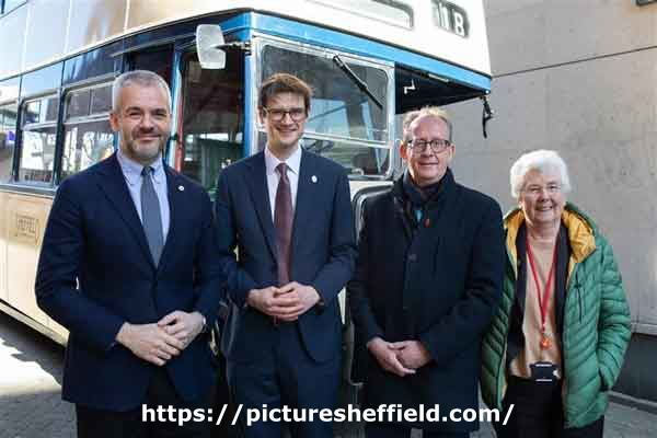 Second right is: Stephen Houghton, Leader, Barnsley Council. First right is: Ros Jones, Doncaster Mayor. South Yorkshire's Mayor and leaders of of South Yorkshire councils agreed to introduce bus franchising across the region, taking another element of public transport in Sheffield into public control. Image from a Sheffield City Council news release. |