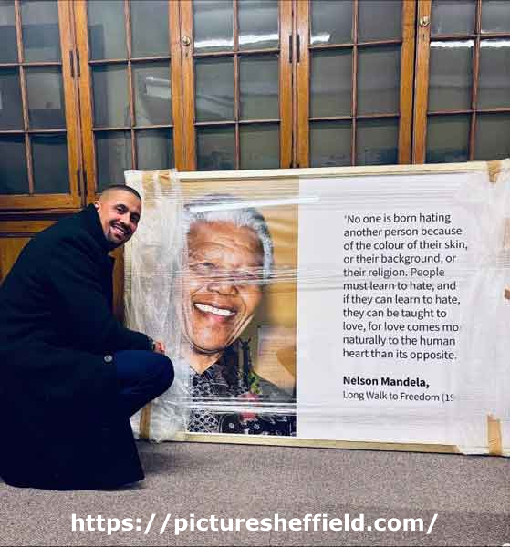 | Sheffield City Council's Head of Employee Engagement, Inclusion and Wellbeing, James Jackson with a new portrait of Nelson Mandela, Sheffield Town Hall | |