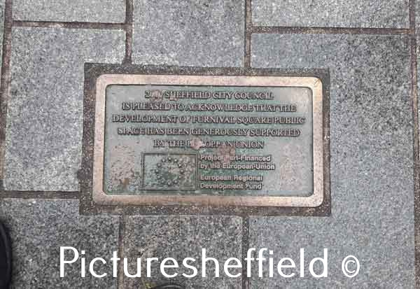 Plaque reads: 2010 Sheffield City Council is pleased to acknowledge that the development of Furnival Square public space has been generously supported by the European Union. Project part financed by the European Union European Regional Development Fund [ERDF]. |