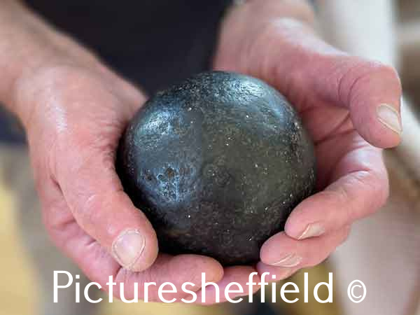 | Cannonball dug up from the grounds of Burnside House, Wood Fall Lane, Low Bradfield in 2023 | |