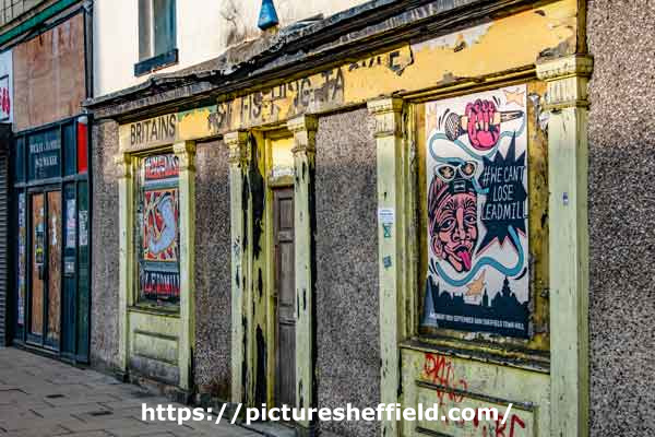 Once the largest fishing tackle shop in Sheffield, housed in the former premises of the New White Lion public house. Note the 'We can't lose Leadmill' [nightclub] grafitti. |