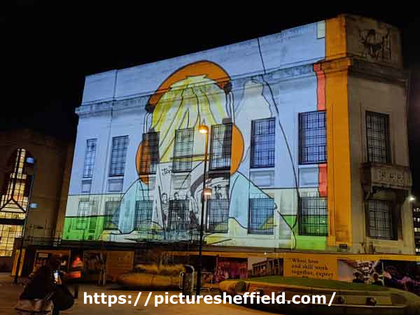 This light show was part of 'Light up Sheffield: Three Iconic Buildings, illuminated with Sheffield Art'. The buildings included Sheffield Cathedral, Sheffield Central Library and Pounds Park.