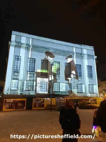 This light show was part of 'Light up Sheffield: Three Iconic Buildings, illuminated with Sheffield Art'. The buildings included Sheffield Cathedral, Sheffield Central Library and Pounds Park.