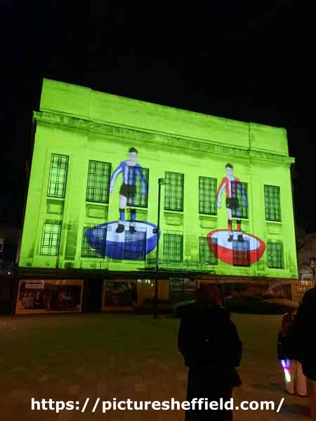This light show was part of 'Light up Sheffield: Three Iconic Buildings, illuminated with Sheffield Art'. The buildings included Sheffield Cathedral, Sheffield Central Library and Pounds Park.