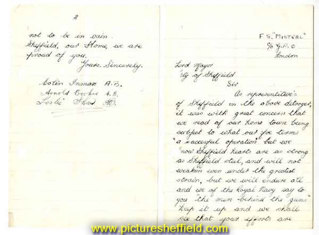 Lord Mayor, City of Sheffield. Sir, As representatives of Sheffield in the above destroyer [French Ship Mistral], it was with great concern that we read of our home town being subject to what our fore terms a successful operation but we know Sheffield hearts are as strong as Sheffield steel, and will not weaken even under the greatest strain, but we will endure all and we of the Royal Navy say to you 'the men behind the guns' keep it up and we shall see that your efforts are not to be in vain. Sheffield, our home, we are proud of you. Yours sincerely, Colin Inman, Arnold Booker and Leslie Shaw. Original at Sheffield City Archives CA538/59. |