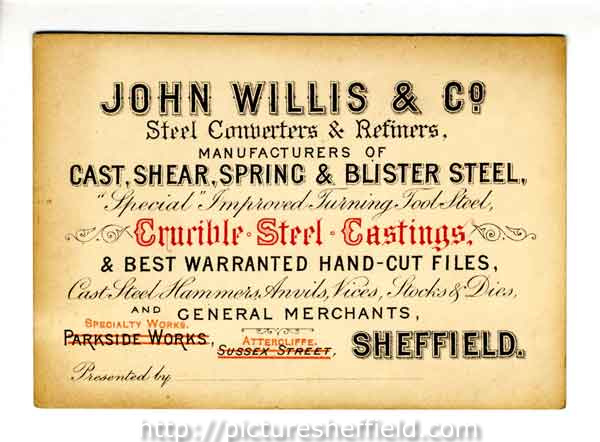 | John Willis and Company, Speciality Works, Attercliffe - formerly Parkside Works, Sussex Street, Sheffield - business card, c. 1890 | |