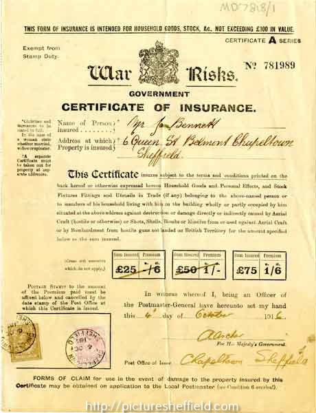 This certificate insures ... household goods and personal effects, and stock fixtures fittings and utensils in trade (if any) ... against destruction or damage directly or indirectly caused by Aerial Craft (hostile or otherwise) or shots, shells, bombs or missiles from or used against Aerial Craft or by Bombardment from hostile guns not landed on British Territory... Sum insured pound;75. Premium 1s. 6d. World War One saw mainland Britain attacked by enemy guns and bombs for the very first time. The first Zeppelin bombing raid took place over Kent in December 1914. The same month Scarborough, Hartlepool and Whitby on the north east coast of Britain were attacked by German ships in the North Sea. Sheffield experienced a Zeppelin raid on 25th September 1916. It is interesting to note that this certificate is dated 4th October, just 9 days after the raid. Original at Sheffield City Archives: MD7818/1. |