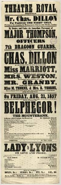 Theatre Royal, Sheffield. Mr Chas. Dylan For positively one night only, previous to his resuming the management of the Lyceum Theatre, London. By desire, and under the immediate patronage of Major Thompson, and the officers of the 7th Dragoon guards. Mr Charles Dillon in conjunction with the popular tragedienne and, Miss Marriott, of the Theatres Royal, Drury Lane and Surrey; the favourite actress, Mrs Weston, now of the Royal Lyceum Theatre on Drury Lane; Mr Granby, from Mr Chas. Kean’s Princess’s Theatre. Miss M. Thorne, and Mrs R. Thorne, from the Princess's Theatre, Leeds, together with a host of ladies and gentlemen, selected from the principal metropolitan theatres. On Friday, Aug. 21, 1857 the performances will commence with the grand drama of ‘Paillasse’, from the French of M. M. Marc Fournier and Dennery, called Belphegor! The Mountebank. Overture by the band. The whole to conclude with the play of The Lady of Lions or Love and Pride. [Performers]: Miss Barlow, Miss Barnett, Mr Beverley, Mr Charles Dillon / Charles Dylan [1819-1881], Mr Dolman, Mr Grainger, Mr Granby, Mr Harding, Mr Jones, Miss Marriott [Alice Marriott 1824-1900], Mr Montague, Mr Morgan, Mr Normanton, Mr Parsey, Miss Smith, Miss M. Thorne, Mrs R. Thorne, Mr De Ville / Diville / Deville, Mr Walton, Mr Wareham, Mrs Weston, Miss Jessie Wilson, Mr Wilton, and Mr Young. Prices of admission - Boxes, 3s. Stalls, 2s. Pit, 1s. Gal. 6d.Doors open 7 o’clock, commence at half-past. Second price at nine o’clock. Boxes, 1s 6d. Stalls, 1s. No second price to pit or gallery. [Printed by] W. R. Marsden, Printer, 26 Change Alley, Sheffield. Original at Sheffield City Archives: BC/16/20. |