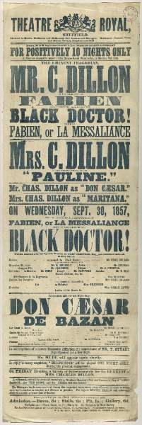 Theatre Royal, Sheffield. Licenced to Messrs Wolfenden and Melbourne. Sole lessees and managers. Residences Paragon Street and Station Terrace, Kingston upon Hull. Messrs W. and M. beg to announce Mr and Mrs Charles Dillon and company for positively 10 nights only as they are engaged to appear at the Theatre Royal, Manchester, on Monday, Oct. 12th. The eminent tragedian Mr C. Dillon in the character of Fabian n John Oxenford, esquire’s, version of The Black Doctor! entitled Fabian, or La Messalliance. Mrs C. Dillon in her original character of Pauline. Mr Chas. Dillon as ‘Don Caesar’ Mrs Chas. Dillon as ‘Maritana’ On Wednesday, Sept. 30, 1857, will be presented the dramatic play of Fabian, or La Messalliance being an adaptation of The Black Doctor! written expressly for the Lyceum Theatre, by John Oxenford, esquire, and performed upwards of fifty nights. To conclude with (for this night only) Don Caeser de Bazan. In consequence of a severe domestic affliction the appearance of Mr T. Stuart is postponed for a few days. Mr Mude will appear again shortly. In reply to many inquiries 'Belphegor' will be played one night only during the present engagement. On Friday evening, a variety of entertainments for the benefit of Mrs Charles Dillon. [Performers]: Mr Barrett, Mr H. Beverley, Mr Burt, Mr J. Chester, Mr Clifford, Mr Charles Dillon [1819-1881], Mrs Charles Dillon, Mr Dolman, Miss Graham, Miss Grainger, Mr Grainger, Miss Sarah Lewis, Mr S. May, Miss Thorne, and Mrs Weston. In rehearsal, and will be produced immediately, Westland Marston's new and successful play of ‘Life's Ransom’; also, the ‘Cagot’; and ‘The Three Musketeers’. The managers beg to announce that during this important engagement every effort will be made to render each representation as complete and effective as possible. The regular winter season will commence about the middle or latter part of October. Doors open at half past Six o’clock, performances to commence at Seven. Admission - Boxes, 3s.; Stalls, 2s.; Pit, 1s.; Gallery. 6d.Half price at 9 o’clock. Boxes, 1s 6d. Stalls, 1s. No half price to pit or gallery. The box plan is now open at Mr Evans's Music Saloon, 51, Norfolk Street. No admittance behind the scenes. [Printed by] W. R. Marsden, Printer, Sheaf Office, 26 Change Alley, Sheffield. Original at Sheffield City Archives: BC/16/21. |