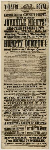 Theatre Royal Lessees and managers Messrs. Wolfenden and Melbourne, 25, Arundel Street, Sheffield.Glorious success of Humpty Dumpty. Grandjuvenile nights!Half price to boxes and pit:Boxes 1s., Pit, 6d., Gal. 6d.Monday, Tuesday, Wednesday and Thursday, Jan 18, 19, 20 and 21, 1858To commence with the grand historical pantomime, introducing a variety of local, vocal, moral and whimsical events, (on a scale of grandeur never before witnessed in Sheffield), entitledHumpty Dumpty!Crook’d Back Dick and Jane Shore, or HarlequinPearl Prince and Grape Queen!Patronised by the Siamese ambassadors. (The especial guests of Her most Gracious Majesty, the Queen), and the elite of the town ...Programme of the concluding pieces on each of the above-mentioned evenings; On Monday, Children in the Wood. On Tuesday, The Spitalfield’s Weaver. On Wednesday, The Little Treasure. On Thursday, Hunter of the Alps!The managers beg to announce they have made arrangements with the Midland Railway Company for special train from Sheffield to Rotherham, on Tuesday evening, at Half Past Ten O'clock, at the usual fares.[Performers (and characters?)]: Mr Abbott, Miss S A. Booth, Miss M. Cuttress, Mr Denial, Mrs Sarah Gamp, Mrs Harris, Mr Hemmings, Herr Hendrick, Mr Hicks, Mr M. Hildebrand, Mr Irish, Miss Jackman, Mr Jackson, Mr Louis Leglere, Monsieur T. Le’Grape, the Brothers Longneck, Miss MacGregor, Mr Marchant, Mr Mew Mew, The brothers Oxen, Mr Quickheel, Mr Rivers, Mr Squeak Squeak, Mr Staunton, Mr N. Teason, Masters T. and J. Thompson, Mr Wilson.[Printed by] W. R. Marsden, 26, Change Alley, Sheffield.Original at Sheffield City Archives: BC/16/25. |