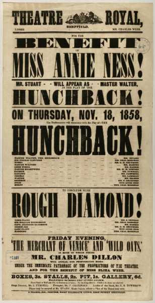 Theatre Royal, Sheffield.For theBenefitofMiss Annie Ness!Mr Stuart will appear as Master Walter,in the play of TheHunchback!On Thursday, Nov 18, 1858,The performances will commence with the play of theHunchback!To conclude withRough Diamond!Friday evening,The Merchant of Venice and Wild Oats,in both of which piecesMr Charles Dillonwill appear. The performance beingunder the immediate patronage of the proprietors of the theatreand for the benefit of Miss Eliza Webb.[Performers]: Mr Barton, Mr Campbell, Mr F. Craxford, Mr Charles Dillon, Mr Harris, Mr Charles Horsman, Mr Lambert, Mr Milner, Miss Annie Ness, Mr J. Neville, Mr W. H. Simpson, Mr G. H. Smythson, Mr Stuart, Mr J. Tyrrell.Boxes 3s., Stalls, 2s., Pit 1s., Gallery 6d.Half price to boxes only at nine o’clock. Doors open at half past six, to commence at seven. No smoking allowed. Children in arms not admitted.Stage director, Mr. J Tyrrell. Prompter, Mr F Craxford. Leader of the band, Mr T. S. Townrow.Places may be secured Mr. Evans’, Music Saloon, where plan of the boxes may [be] seen.J. Pearce, jun., Printer, Daily Telegraph Office, High Street, Sheffield.Original at Sheffield City Archives: BC/16/67. |