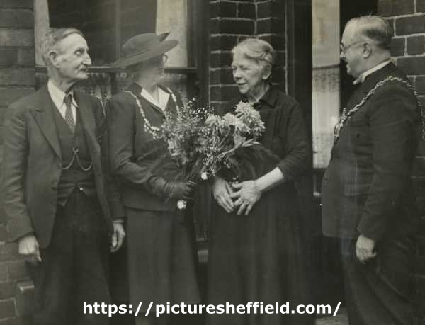 | Lord Mayor, Councillor Samuel Hartley Marshall JP and the Lady Mayoress, Mrs Marshall meeting Mr and Mrs T. W. Scott of No. 2 Terry Street, Attercliffe on their diamond wedding anniversary | |