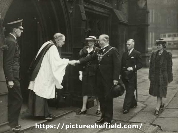 | Lord Mayor, Councillor Samuel Hartley Marshall JP and the Lady Mayoress, Mrs Marshall being welcomed by the Provost of Sheffield and archdeacon, Dr A. C. E. Jarvis for the National Day of Prayer service, Sheffield Cathedral, Church Street | |