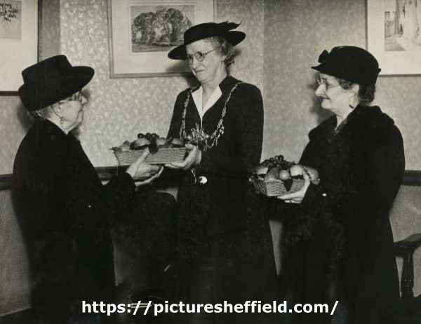 | Lady Mayoress, Mrs Marshall presenting baskets of fruit to Mrs Mason and Mrs Flannery, 2 of 3 buffer girls chosen 50 years ago as models for panels in the Town Hall, Pinstone Street | |