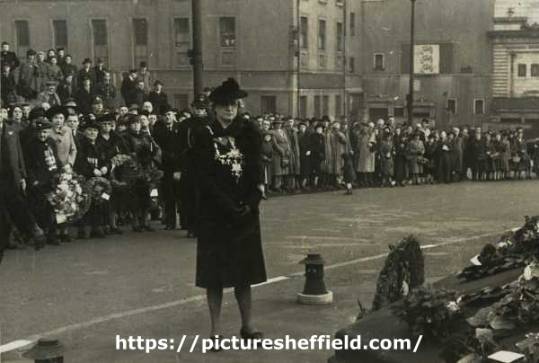 | Lady Mayoress, Mrs Marshall after laying a wreath on Armistice Day at the Barkers Pool war memorial , Barkers Pool | |
