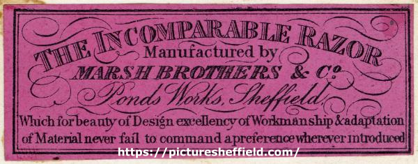 ![Label for the incomparable razor, Marsh Brothers and Co. [Ltd., steel manufacturers], Ponds Works, [Shude Lane], Sheffield, c.1877](https://www.picturesheffield.com/imagefiles/jpgl_sheffield3//arc08025.jpg)
