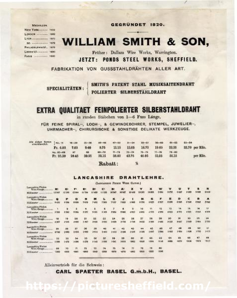 | Price list for Lancashire pinion wire gauge, William Smith and Son, Dallam Wire Works, Warrington, c. 1905 | |