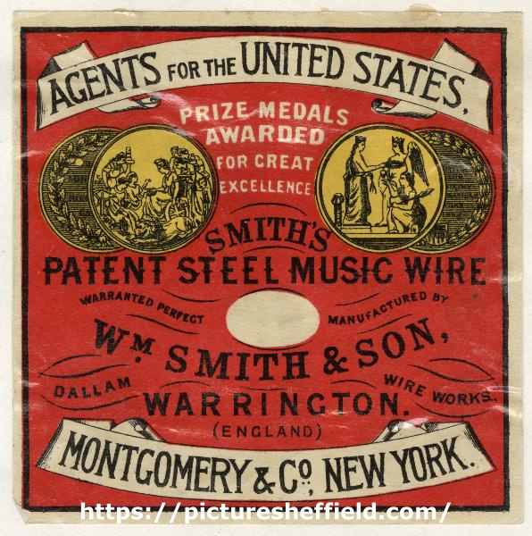 | Label for Smith's patent steel music wire, Montgomery and Co. New York, USA, agents for William Smith and Son, Dallam Wire Works, Warrington, c. 1905 | |