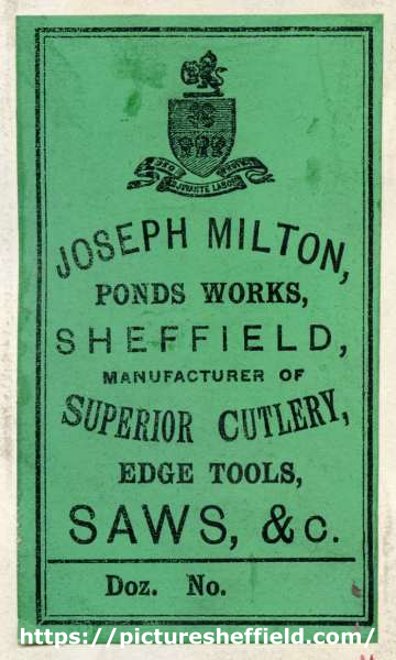 ![Label for Joseph Milton, Ponds [Steel] Works, [Shude Lane], Sheffield, manufacturer of superior cutlery, edge tools, saws etc., c.1895](https://www.picturesheffield.com/imagefiles/jpgl_sheffield3//arc08140.jpg)
