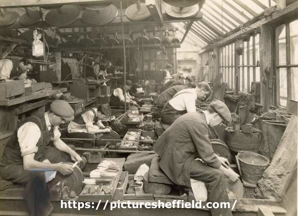 Image shows the operations of grinding, glazing and polishing of knife blades on a grinding wheel. Original photograph at Sheffield City Archives: X1062/2/7/6/1. |