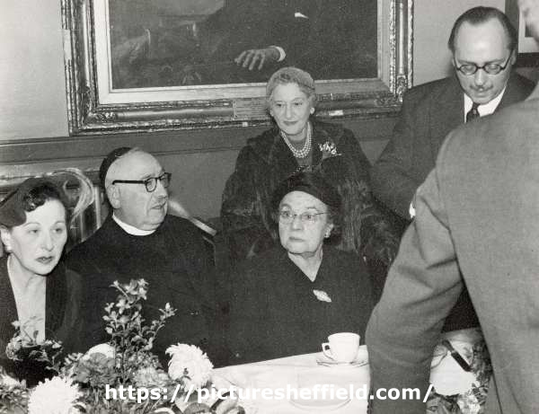 [Mrs Waldenberg?] Rev Joshua Kahn [and Mrs Kahn?] seated, Jack Cohen standing, in Assembly Hall, Wilson Road Synagogue. Original at Sheffield City Archives: JCA/1/2/8/3. |