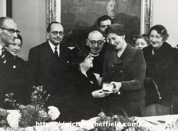 Includes Jack Cohen, [Mrs Kahn], Rev Kahn, Pearl Cohen, in Assembly Hall, Wilson Road Synagogue. Original at Sheffield City Archives: JCA/1/2/8/3. |