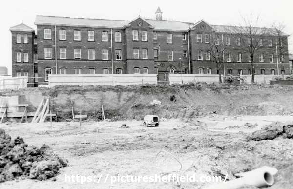 | Building site for the Clinical Sciences Centre showing (back) Clock Tower building, Northern General Hospital, Fir Vale | |