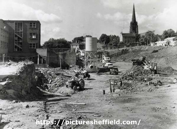 | Construction work on new teaching hospital, (Royal Hallamshire Hospital), Glossop Road showing (top right) St. Mark C. of E. Church, Broomfield Road | |