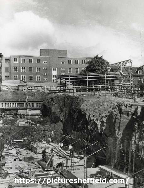 | Construction work on site of new teaching hospital, (Royal Hallamshire Hospital), Glossop Road showing (top left) St. Mark C. of E. Church, Broomfield Road | |