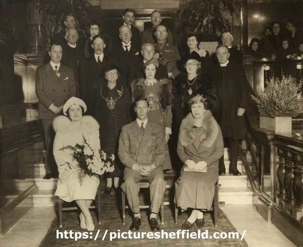 | Royal visit of their Majesties King George VI and Queen Elizabeth, Town Hall, Pinstone Street showing (2nd left standing) Mrs. Ann Eliza Longden, Lord Mayor | |