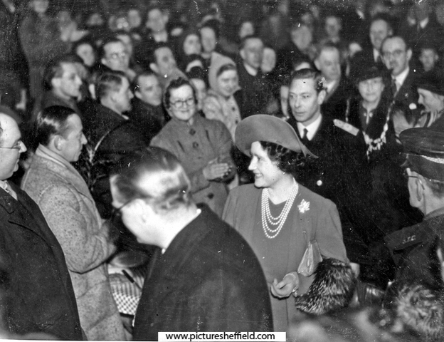 | King George VI and Queen Elizabeth visit a community feeding station at the City Hall during the Blitz | |