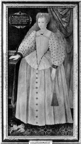 Lady Arabella Stuart (1575-1615). Daughter of Charles Stuart, Earl if Lennox and Elizabeth Cavendish, Grand-daughter of Bess of Hardwick. Cousin to James I whose next heir she was to the throne of England and Scotland. She was incurred the King's displeasure by marrying William Seymour and was sent to the Tower where she died insane. |