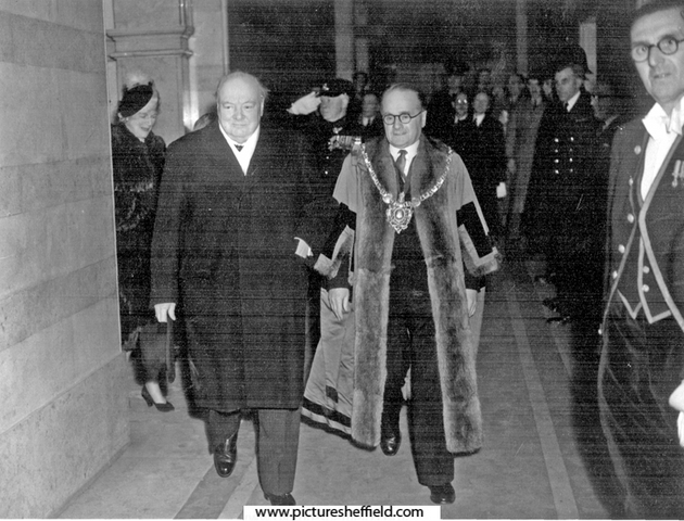 | Official visit of Winston Churchill, with Alderman Herbert Keeble Hawson, Lord Mayor, arriving at City Hall | |
