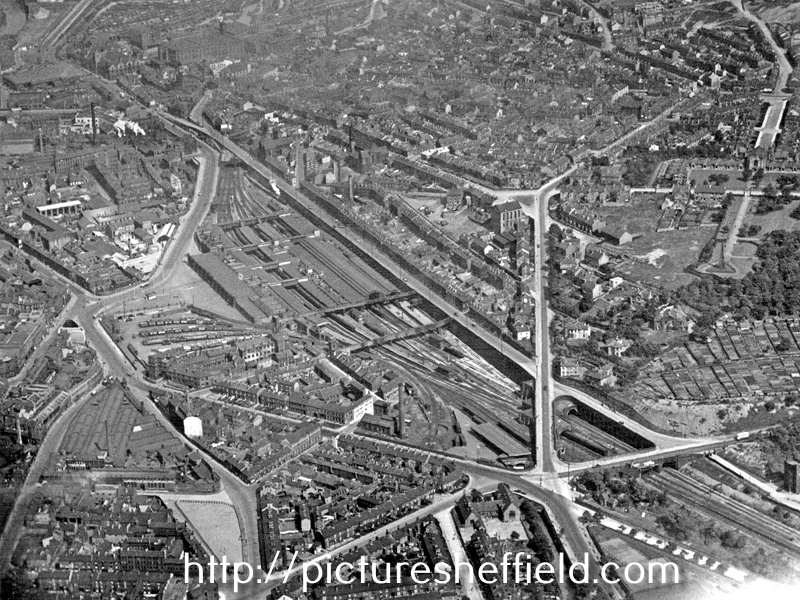 | City Centre and Park including Sheaf Street leading to Sheffield Midland railway station, centre, Granville Street behind, Shrewsbury Road leading to South Street Park, Shrewsbury Hospital, extreme right and Tram Car Depot, Leadmill Road, bottom left | |